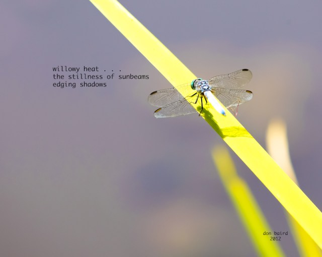 How great is that?!?!?!?!?!? The shadow of a dragonfly! Your first line is certainly one to contemplate… “willowy heat”… I can just feel the slight breezes in their long branches on the edge of a creek somewhere….